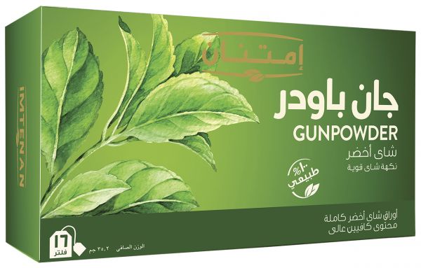 شاي أخضر جان-باودر طبيعي 100% من إمتنان. يعد أكثر أنواع الشاي الأخضر الصيني انتشاراً وشعبية، منتج من أوراق الشاي الأخضر الكاملة مكتملة النضج عالية الجودة والمعاملة بطريقة خاصة تحفظ القيمة الغذائية والتي يتم لفها في لفائف صغيرة تشبه البارود مما يعطي هذا الشاي اسمه المميز.